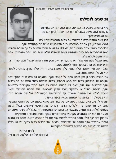 8 שנים לנפילתו כ"א בחשוון. בשביל כל המדינה היום הזה היה יום בחירות לרשויות המקומיות. בשבילנו הוא היה יום הזיכרון הפרטי. יום האזכרה שלך. בכל שנה מחדש מדהים לראות את כמות האנשים שמגיעים לסבא וסבתא, בין אם זה באזכרה, ביום הזיכרון או בטיול יום ההולדת שלך. הכל כבר נאמר: כמה סוחף היית, שאפילו 28 שנים אחרי מגיעים כל כך הרבה אנשים. כמה שהחברים הם כבר משפחה וכמה שאפילו שלא היית כאן יותר משהיית, אתה עדיין חקוק לכולנו בלב. כמה שבכל פעם אני מגלה אדם נוסף שהיית חלק מחייו וכמה שבכל פעם קורה דבר חדש שמרגש אותי באופן ייחודי לאותה שנה. ובכל זאת, איך אפשר שלא לומר עליך משהו ביום הזה? שלא לציין, להזכיר, לספר. הרי זה כל הטעם באזכרה... את הפרח ציפור גן-עדן שמנו היום על הקבר שלך, ובמקרה גם היה מונח בתוך ואזה שקופה על השולחן בבית של סבא וסבתא, בדיוק מושלם כנגד התמונות המוגדלות שלך שתלויות שם. טוב, זאת לא חכמה, כמעט כל פינה בבית מקושטת בתמונות שלך, כלוחם, כחייל או כמפקד, אבל עדיין כשראיתי את הפרח הרגשתי שאני חייבת לצלם. ואז פתאום חשבתי על המשמעות הסימבולית של שם הפרח הזה, הרי בשבילנו זה בדיוק מה שאתה עכשיו: ציפור גן-עדן. יצא לי לחשוב היום בבוקר, שזה יום של בחירות, שהוא בעצם יום של חופש שאפשר לנצל יום חד פעמי כזה לכל-כך הרבה דברים. מה הסיכוי שאנשים בכלל יגיעו? נוכחתי לגלות, כמו תמיד, שבעבור כל החברים והמשפחה זה בכלל לא משנה איזה יום זה... היום הוא יום האזכרה שלך, אז היום זוכרים אותך ובאים ומכבדים ומחבקים. אז רונן, דוד יקר שלי, תודה שזכיתי לראות שוב את כל האהבה הזאת. תודה על הזכות להיות אחיינית שלך ותודה על שבזכותך ובזכות עוד חללים רבים כמוך, יש לנו בכלל מדינה כדי לעשות בה בחירות לרשויות המקומיות. לירון ארזואן אחיינית של רונן שלמה ז'ורנו ז״ל